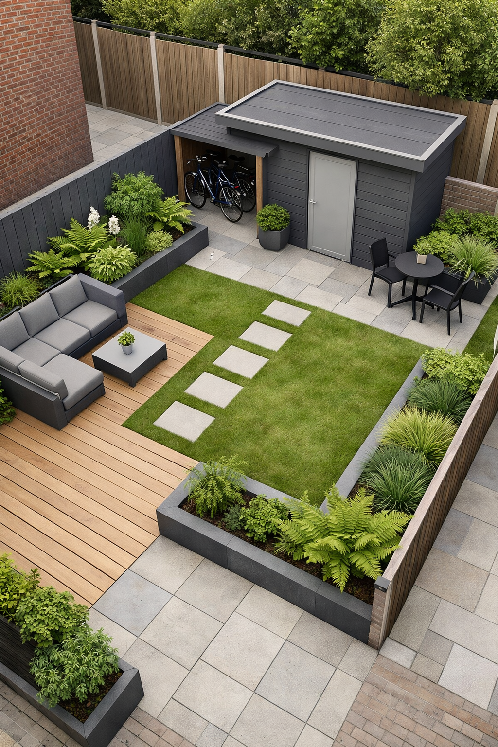 Een moderne tuin wordt vaak aangelegd met strakke lijnen en een duidelijke indeling. Elementen zoals het gazon, terras en de borders hebben ieder een eigen plek en functie. Door deze overzichtelijke opbouw ontstaat er een rustige en verzorgde uitstraling.